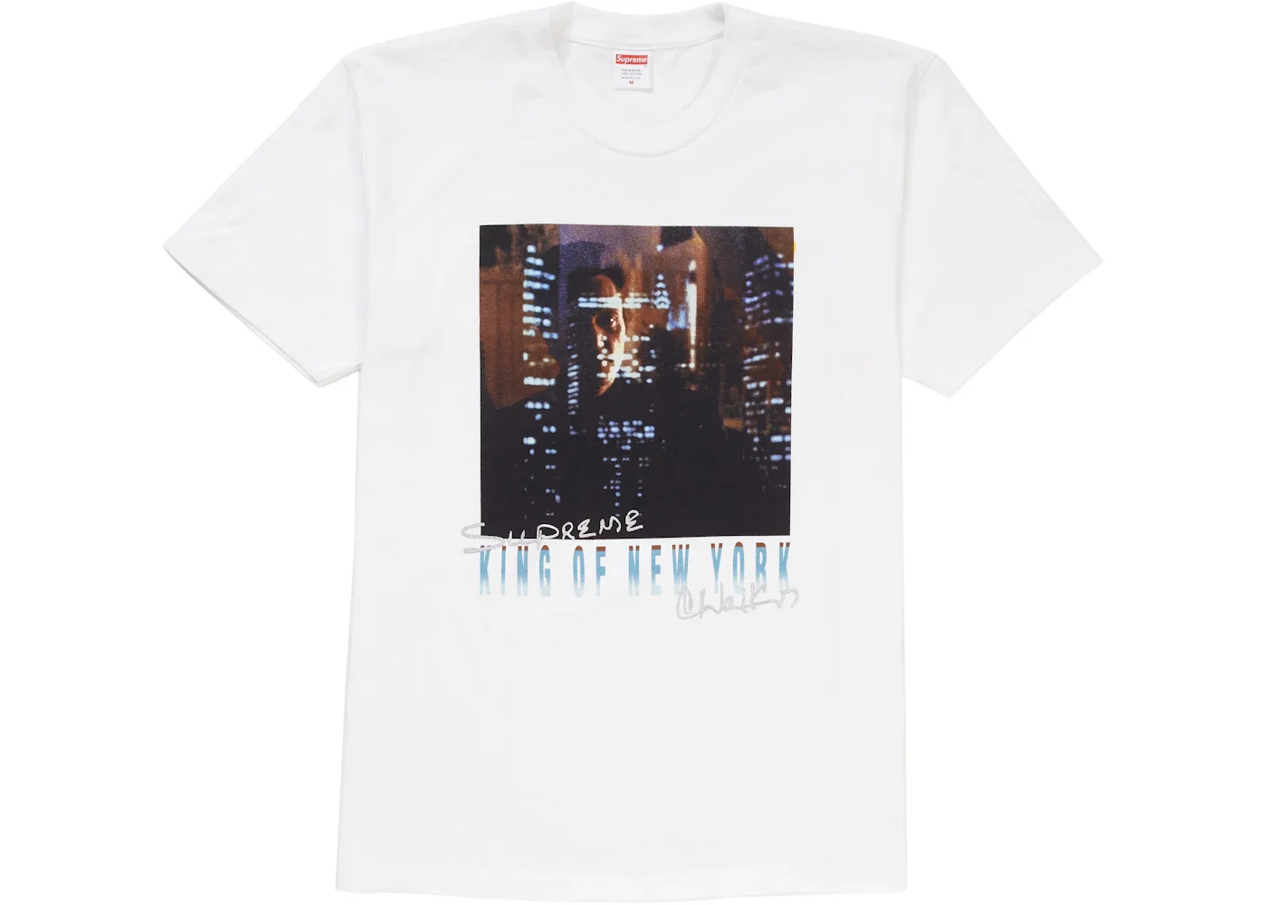 "From now on, nothing goes down unless I'm involved." Supreme’s first drop of SS19 included the Christopher Walken King Of New York Tee paying homage to the award winning film. The tee features an edited movie cover, removing Christopher Walken’s name in the traditional type and adding a handwritten "Supreme" and "C. Walken". This tee released on February 21st, 2019 and retailed at $48 USD. - Season SS19 - Color White - Release Date 2019-02-21 - Retail Price 48 - Featured false