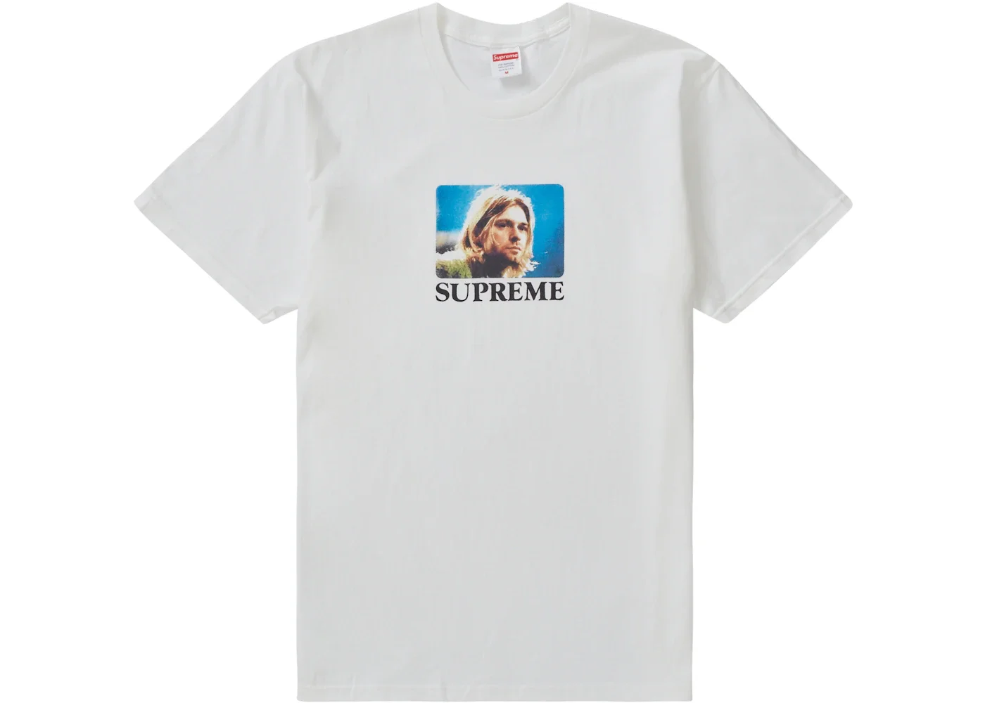 The Supreme Kurt Cobain Tee White is a crew-cut T-shirt produced by Supreme, a New York City-based streetwear brand known for its connection to pop and skate culture. It features a screen-printed image of Kurt Cobain, the late American musician and lead singer/guitar player of Nirvana. The T-shirt features a standard, short-sleeve silhouette, and a rounded neck. The image of Cobain displays his head and shoulders against a blue background. Beneath the image, " SUPREME" lettering in bold black is printed across the shirt. Both the image and lettering are located on the chest. Like many Supreme T-shirts, the "Kurt Cobain Tee White" is made of cotton and comes in white. Our StockX experts like that this T-shirt serves as a collectible item for both Supreme and Nirvana fans. The Supreme Kurt Cobain Tee White was released on February 26, 2023, as part of the Spring/Summer 2023 collection, and retailed at $48. - Season SS23 - Color White - Release Date 2023-02-16 - Retail Price 48 - Featured false - Uploaded By LL