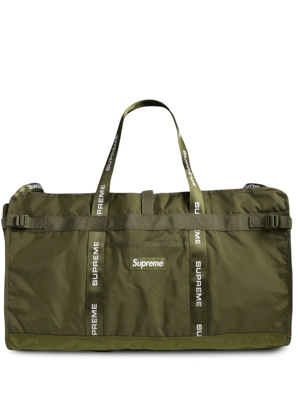 large Haul tote bag Supreme's String Large Haul Tote bag arrives in a charming olive green hue. The accessory has a spacious interior and is highlighted with a signature box logo on the front and logo-printed handles. Highlights - Olive green - Logo patch to the front - Logo-print handles - Open top - Main compartment Made in United States Composition Outer: Nylon 100%