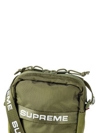 logo-print shoulder bag Boasting an olive green colourway, this AW22 bag is defined by its logoed webbing shoulder strap. Constructed from water-resistant fabric, this compact accessory provides storage space with its front zip compartment and internal mesh pocket. Made in United States Composition Outer: Nylon 100%