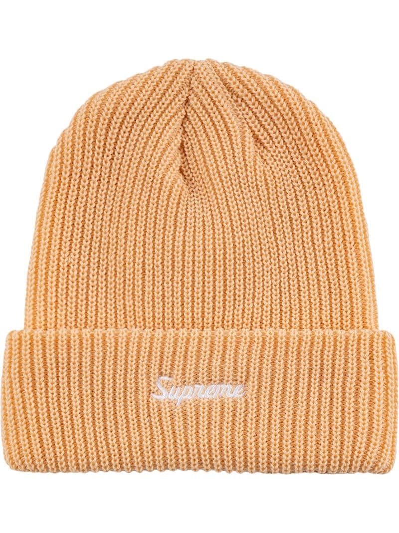 Beige loose gauge beanie from SUPREME featuring embroidered logo to the front, ribbed knit and turn-up wide brim. Highlights - Beige - Embroidered logo to the front - Ribbed knit - Turn-up wide brim Made in United States Composition Acrylic 100%