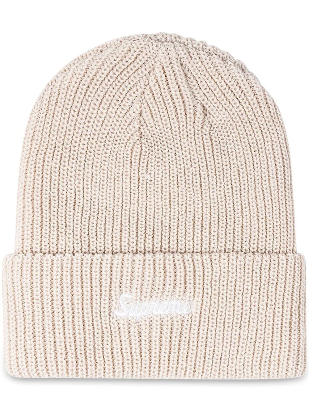loose gauge beanie Supreme's loose gauge beanie is back - this time, in a beige colour. The accessory features a minimal design, crafted from cotton, enhanced with a white embroidered logo on the front. Imported Composition Acrylic 100%