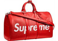 The Louis Vuitton x Supreme Keepall Bandouliere 45 features Supreme’s signature logo in white Futura Heavy Oblique font on classic Louis Vuitton Epi leather. Normally available in four different sizes, this 45 is a great weekend bag and comes with silvertone hardware, leather handles, leather name tag and a removable strap with shoulder patch, making it easy to carry anywhere you go. Epi leather, introduced 1985, became the first permanent leather collection of Louis Vuitton, and is tanned with plant extracts before dyeing. The process allows for colors as vibrant as this shade of red to stand out. Introduced in 1930, the Louis Vuitton Keepall was one of the first bags ever made by Louis Vuitton that is still in production today. Supreme debuted in 1994,140 years after Louis Vuitton was founded in Paris. Louis Vuitton’s collaboration with Supreme, dubbed the "coolest streetwear brand in the world right now" by GQ, was first shown at Paris Men’s Fashion Week in January 2017. The capsule collection includes clothing, accessories, shoes, trunks and leather goods. Both stylish and practical, the Louis Vuitton x Supreme Keepall Bandouliere 45 is the perfect personification of classic LV and the highly sought after Supreme brand of cool. - Retail Price 3650 - Included Accessories Strap,Luggage Tag,Loop,Lock and Keys - Color Generic Red - Featured false - Styles Duffle