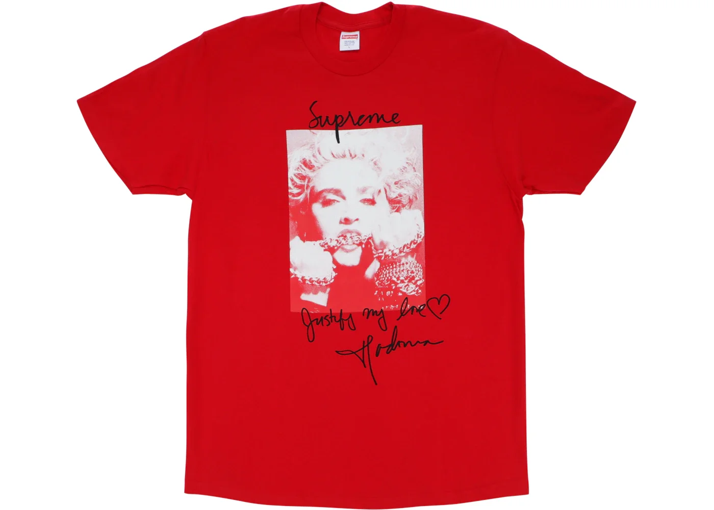 Released on Madonna's 60th birthday, this Supreme Madonna Tee features yet another mega-star now added to Supreme's long list of celebrities that have adorned their famous "photo tees". From Mike Tyson to Gucci Mane (Brrr!), Supreme never fails to disappoint by featuring iconic figures from all walks of life on their apparel. The Madonna Tee released in a variety of colors on August 16th, 2018 for a retail price of $48, and includes her signature with the inscription "Justify My Love", referencing her 1990 hit single. Cop this tee today and satisfy your desire for the freshest tee of the year. - Season FW18 - Color Red - Release Date 2018-08-20 - Retail Price 48 - Featured false