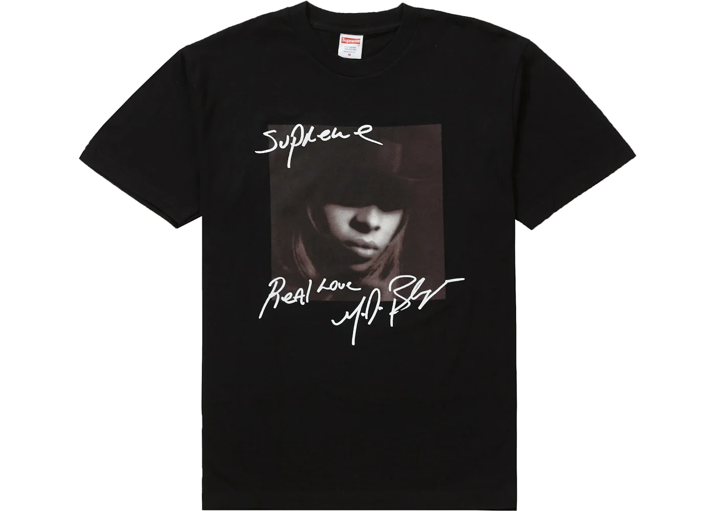 Supreme's Mary J. Blige Tee released as a part of the brand's FW19 debut and was met with immediate demand. The tee features an image of Blige that appears to be the same as the cover of her 1992 album "What's The 411?" but zoomed in on her face more than the album cover. Her signature and the word Supreme is also laid over the image. The Supreme Mary J. Blige Tee released on August 22nd, 2019 and retailed at $48 USD. - Season FW19 - Color Black - Release Date 2019-08-22 - Retail Price 48 - Featured false