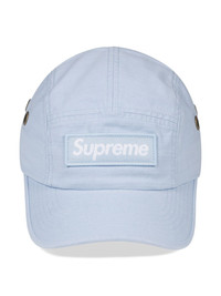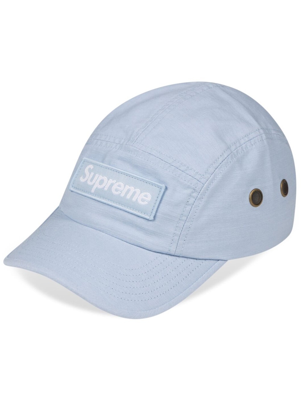 Military Camp cap Supreme's Military Camp cap is back - this time, in a light blue shade. The accessory is crafted from cotton and highlighted by a signature box logo on the front. On the back, an adjustable strap keeps it secure and with the best fit. Highlights - Light blue - Cotton - Signature box logo - Panelled design - Embroidered motif - Curved peak - Adjustable strap to the rear Imported Composition Cotton 100%