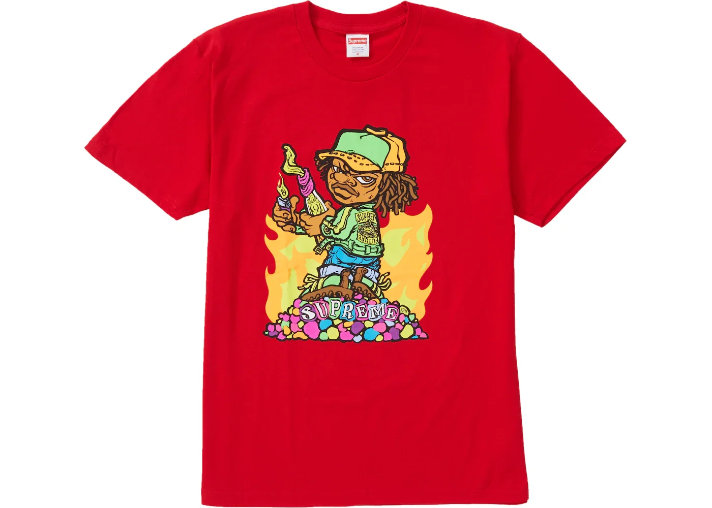 Supreme's Molotov Kid Tee released as a part of the brand's larger drop of tees during Week 6 of their Spring/Summer 2019 collection. The tee features original artwork by Andy Howell of a cartoon style kid holding a molotov, surrounded by flames. The Molotov Kid Tee was released on Thursday April 4th, 2019 and retailed for $38 USD. - Season SS19 - Color Red - Release Date 2019-04-04 - Retail Price 38 - Featured false