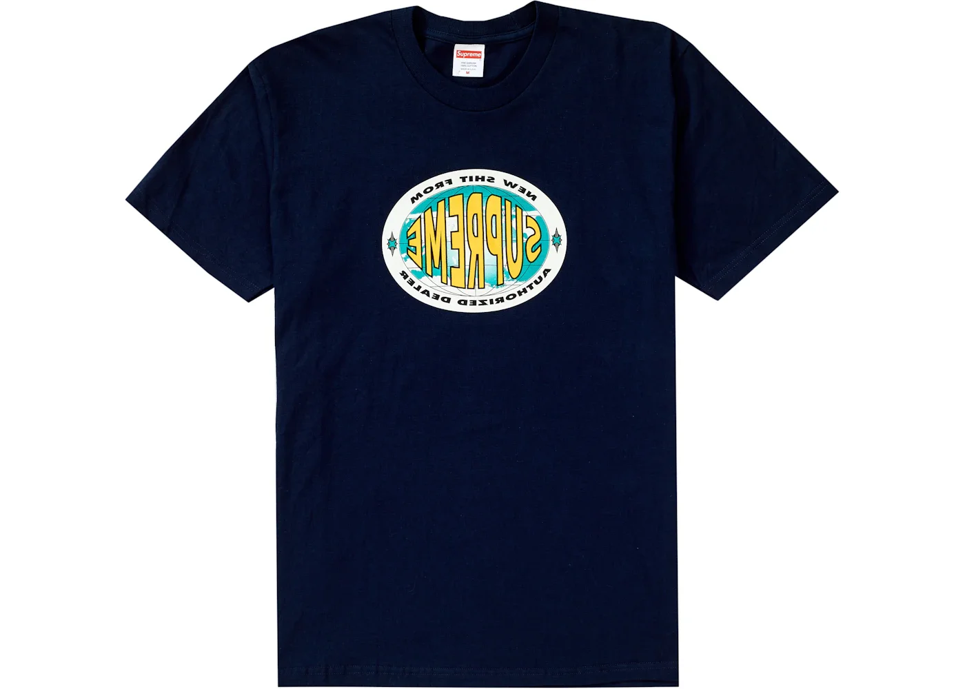 Supreme's New Shit tee was released as a part of Supreme's FW19 Week One drop and features a graphic that says "New Shit From Supreme Authorized Dealer" backwards on the front and has a list of all the different store locations with phone numbers on the back. The Supreme New Shit Tee was released on August 22nd, 2019 and retailed for $38 USD. - Season FW19 - Color Navy - Release Date 2019-08-22 - Retail Price 38 - Featured false