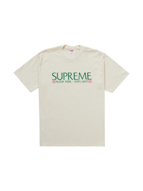 This black t-shirt released as a part of Supreme Fall/Winter 2020 Week 1 along with nine other new graphic t-shirts. The Nuova T-shirt's graphic features the word Supreme above the phrase "Nuova York - Stati Uniti" which is Italian for "New York, United States." The Supreme Nuova T-shirt released on August 20th, 2020 and retailed for a price of $38 USD. - Season FW20 - Color Black - Release Date 2020-08-20 - Retail Price 38 - Featured false