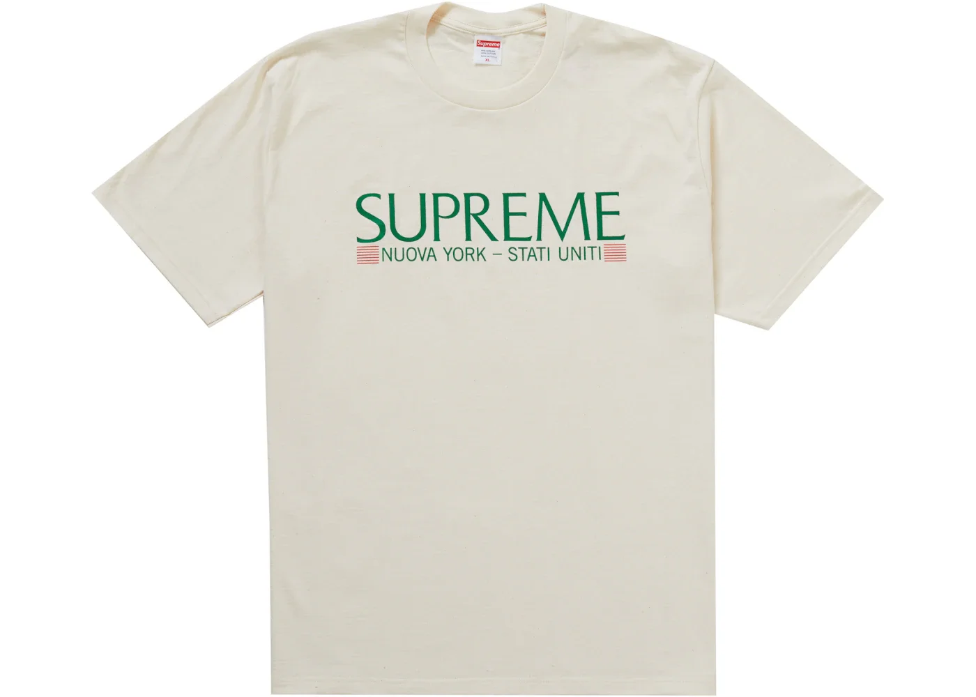 The Supreme Nuova York Tee Natural is a short sleeve cotton classic tee from New York– based brand Supreme that is known for their highly sought after designs and products. The all-cotton Natural Supreme Nuova York Tee shirt presents in a natural, off-white colorway. Boasting short sleeves with a straight hem, it has a classic fit with a straight hemmed waistband and crew neck. You’ll know this is a true Supreme production thanks to the tag at the neck with Supreme branding. The front of the shirt is emblazoned with SUPREME in green. Underneath is a combination of Italian and English words: NUOVA YORK – STATI UNITI. Red and white striped flags or boxes flank both sides of this text. StockX experts think the fun nod to the location of Supreme’s headquarters, New York, is what gives this tee shirt its personality and demonstrates how it is important to stay true to your roots. When it was released on August 20, 2020, the Supreme Nuova York Tee Natural sold for $38 retail. - Season FW20 - Color Natural - Release Date 2020-08-20 - Retail Price 38 - Featured false