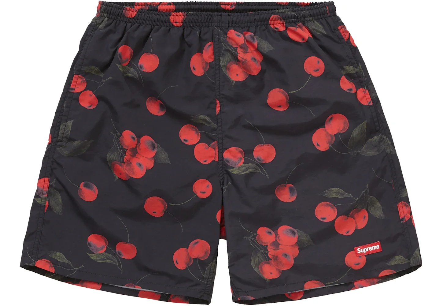 The Supreme Nylon Water Short (SS19) Black Cherry is a mesh-lined nylon swimsuit in a Black Cherry print. The background is printed with images of red and green cherries. The Supreme red box logo appears on the lower left leg and rear pocket zipper pull. Additional features include side pockets, an interior pocket, and an interior drawstring pull. While Supreme is widely known for traditional streetwear like t-shirts and hoodies, the brand also experiments with many other categories of clothing and gear, extending its street aesthetic wherever it deems necessary. Case in point is the Nylon Water Short, which pairs thoughtful functionality with subtle branding in a bold print. In our opinion, the best feature of the Nylon Water Short is its Black Cherry print, which is not a common motif in male swimwear. The Supreme Nylon Water Short (SS19) Black Cherry was released on June 27, 2019, and retailed at $118. - Season SS19 - Color Black Cherry - Release Date 2019-06-27 - Retail Price 118 - Featured false