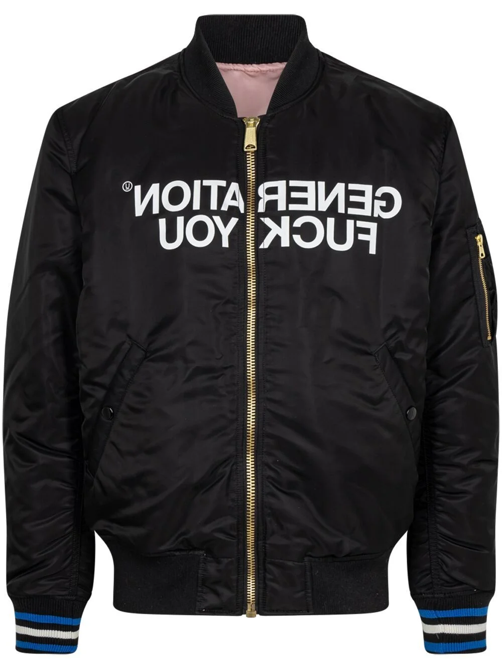 Reversible MA-1 jacket Defined by its streetwear aesthetic and for defying conventions, Supreme has gained cult status since it was founded in 1994. A case in point, this reversible MA-1 bomber jacket is printed with a subversive slogan on the front. Highlights - Black - Reversible - Slogan print to the front - Baseball collar - Front zip fastening - Two press-stud fastening side pockets - Long sleeves - Sleeve zip pocket - Ribbed cuffs and hem - Stripe trim Imported Composition Polyester 100% Washing instructions Dry Clean Only