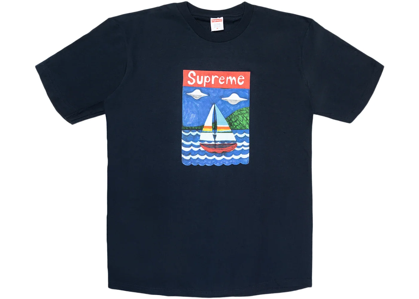 Released as a part of SS20's Week 8 release, the Supreme Sailboat Tee was among seven spring tees to drop. The Sailboat Tee features an original artwork by Joe Roberts of a sailboat in the water with UFO's flying around it and a painted Supreme logo above the painting. The Supreme Sailboat Tee released on April 16th, 2020, and retailed for $38 USD. - Season SS20 - Color Navy - Release Date 2020-04-16 - Retail Price 38 - Featured false