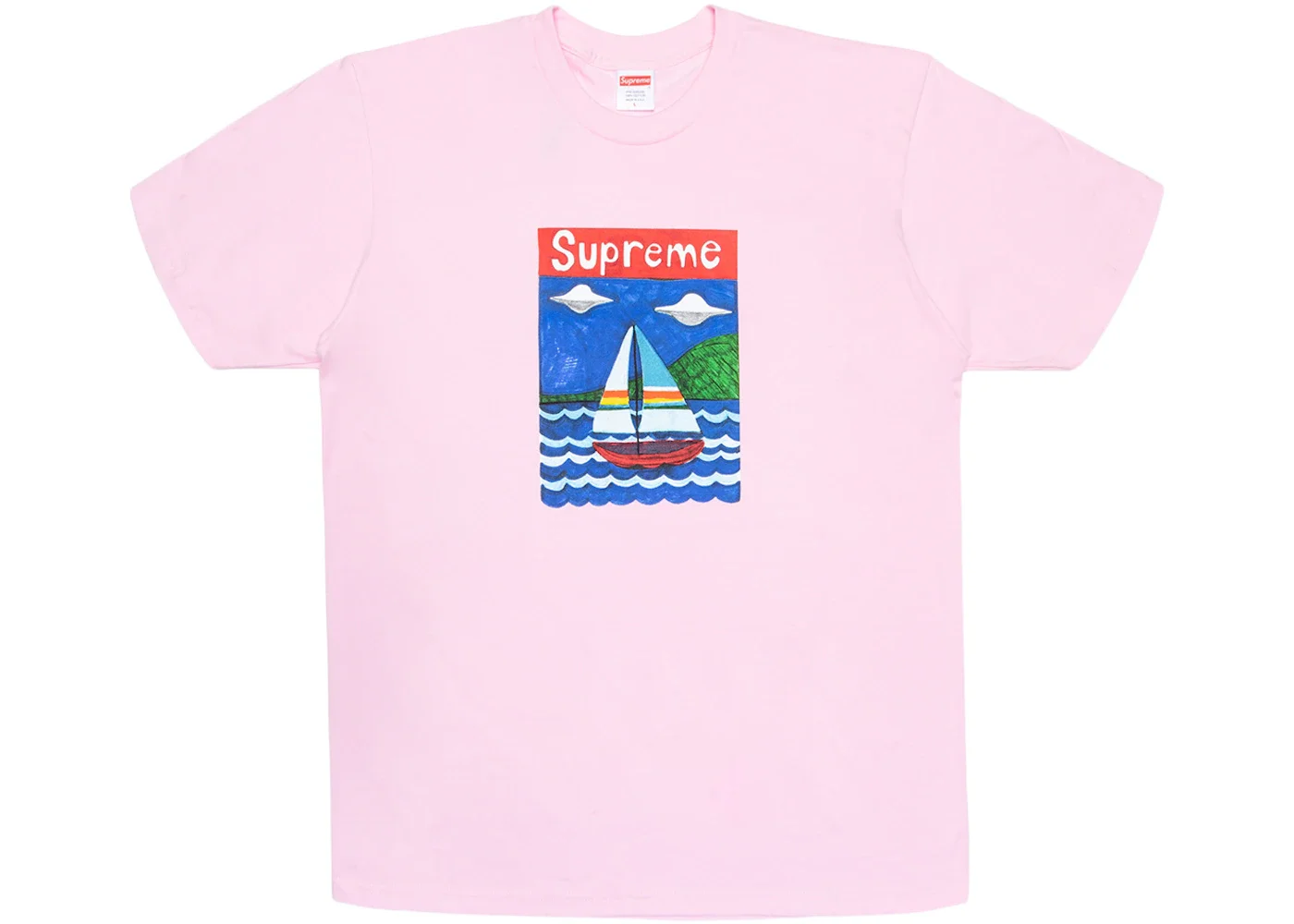 Released as a part of SS20's Week 8 release, the Supreme Sailboat Tee was among seven spring tees to drop. The Sailboat Tee features an original artwork by Joe Roberts of a sailboat in the water with UFO's flying around it and a painted Supreme logo above the painting. The Supreme Sailboat Tee released on April 16th, 2020, and retailed for $38 USD. - Season SS20 - Color Light Pink - Release Date 2020-04-16 - Retail Price 38 - Featured false