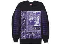 The Supreme Saint Sebastian L/S Tee Black is a long-sleeved t-shirt bearing classical branding and Saint Sebastian motifs. This version of the Supreme Saint Sebastian L/S Tee comes in a black colorway, the background color throughout. The front of the shirt is dominated by a portrait of Saint Sebastian in a forest with arrows through his body as people continue to shoot him. This portrait in the top right corner of the shirt is done in purple and white. Under the portrait, the Supreme brand name appears in the gothic text. The rest of the front is taken up by vines and motifs that resemble a paisley pattern. The Supreme brand name also appears up and down the sleeves in purple and black gothic text. The back bears the brand name in the same style as it appears on the sleeves, but bigger. What we like best about this t-shirt is the purple and white vines surrounding the front portrait. This design brings a unique and classic look to the shirt. The Supreme Saint Sebastian L/S Tee Black was released on February 15, 2024, for $54. - Season SS24 - Color Black - Release Date 2024-02-15 - Retail Price 54 - Featured false - Requester Kelsey K - Uploaded By LL
