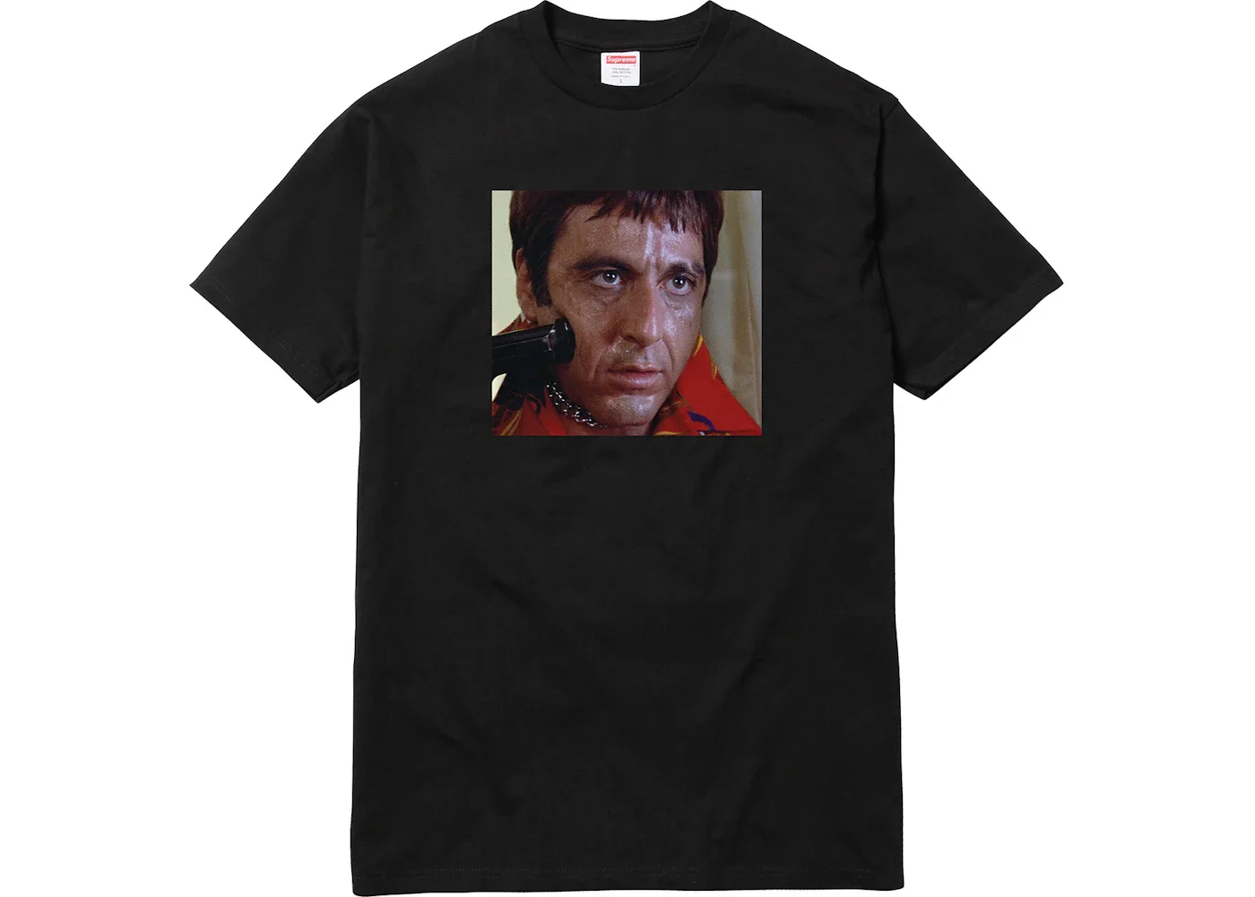 The Supreme Scarface Shower Tee Black is a limited edition t-shirt released by Supreme in collaboration with the iconic 1983 film Scarface. The shirt features a graphic print of Tony Montana, the film's protagonist, taking a shower with the Supreme logo in bold letters above him. The black colorway adds a sleek and edgy touch to the design. Crafted from 100% cotton, the Supreme Scarface Shower Tee Black is soft and comfortable to wear. The shirt is available in sizes small to extra-large, making it accessible to a wide range of customers. The release date for this product was October 12, 2017, and it retailed for $44. Something we love about Supreme Scarface Shower Tee Black is its unique and eye-catching design that pays homage to a classic film. Our experts think the standout feature of this tee is the bold and striking graphic print that is sure to turn heads. The black colorway adds a touch of sophistication to the design, making it a versatile piece that can be dressed up or down. Overall, the Supreme Scarface Shower Tee Black is a must-have for any fan of streetwear and pop culture. - Season FW17 - Color Black - Release Date 2017-10-12 - Retail Price 44 - Featured false