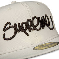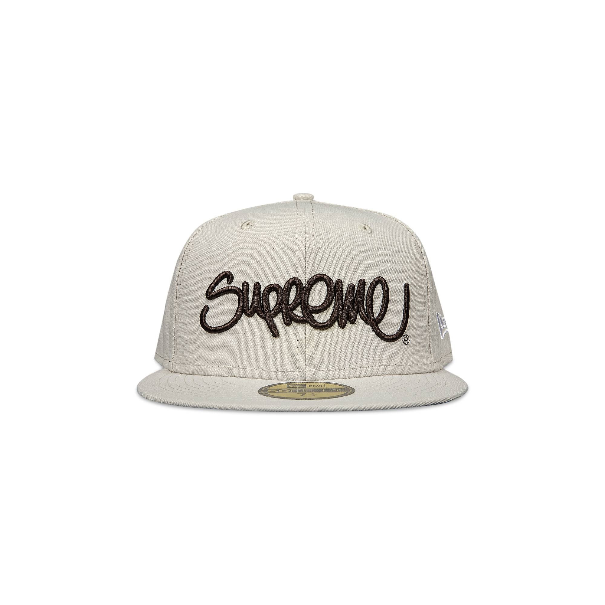 This Supreme hat is executed in white and features a black logo embroidery executed to resemble graffiti handstyle. It was created in collaboration with New Era during the SS22 season.