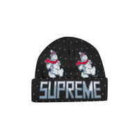 This Supreme beanie is knitted with graphics of snowmen and snowflakes, along with a logo on the hem. Made for the FW21 season, the hat is designed in black.