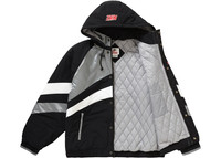 After releasing a collaborative Nike Air Max Tailwind 4 early in their 2019 season, Supreme and Nike have returned for a second release in SS19, this time featuring apparel. Despite being released in May, the collection mostly featured items you'd see in a fall/winter release, including sweaters, hoodies, and sport jackets, all of the vintage looking variety. The water resistant Supreme x Nike Hooded Sport Jacket released in three colorways and feature a quilted inner lining as well as a removable hood. The green, purple, and silver jackets dropped on Thursday, May 23rd, 2019 and retailed at $248 USD. - Season SS19 - Color Silver - Release Date 2019-05-23 - Retail Price 248 - Featured false