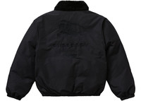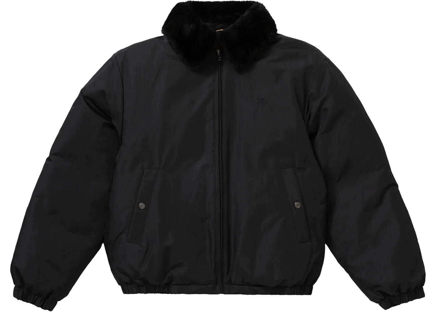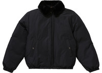 The Supreme Burberry Shearling Collar Down Puffer Jacket Black is a collaborative garment that was released as part of a special edition collection by the brands. This puffer jacket is feather down for insulation and is available in a black colorway. At the back, there is a tonal logo of Supreme and Burberry. This clothing item has a padded design that is completed by a shearling collar. In addition, it has a front zip fastening, two side button-fastening pockets, long sleeves, and a straight hem. The Supreme Burberry Shearling Collar Down Puffer Jacket Black was released on March 10th, 2022, with its retail price set at $598. - Season SS22 - Color Black - Release Date 2022-03-10 - Retail Price 598 - Estimated Retail Price 598 - Featured false