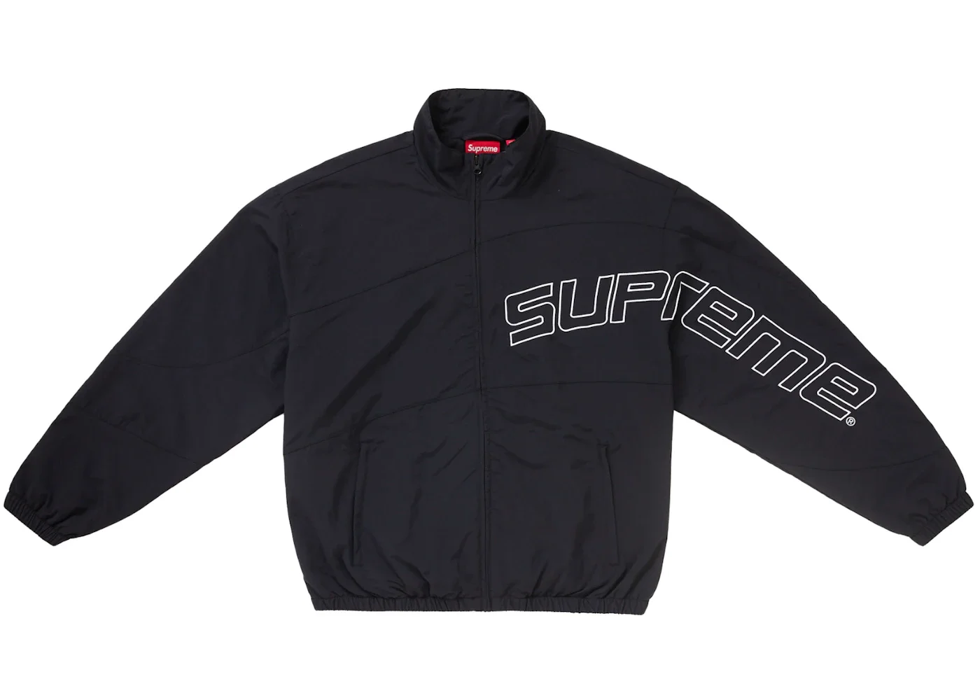 Performance-ready no matter the season, the Supreme Curve Track Jacket (SS24) Black is a standout piece of streetwear for lovers of dynamic fashion. This high-quality jacket from Supreme seamlessly blends streetwear with workout gear, making it a perfect fit for chilly nights skating, sports functions, or simply hanging with friends. Black in color, it features the Supreme logo in bold white outlines across the chest and left arm in bold statement form. The garment is made from lightweight polyester, which gives freedom of movement and is excellent for a cool-down jacket after sport. The jacket includes a high collar, a full zip enclosure, and elasticated arm cuffs. It also has two front zip pockets. We love this jacket's track-star energy with its light fabric and trendy shell cut. The Supreme Curve Track Jacket (SS24) Black was released on April 11, 2024, for a retail price of $168. - Season SS24 - Color Black - Release Date 2024-04-11 - Retail Price 168 - Featured false - Requester Kelsey K - Uploaded By LL