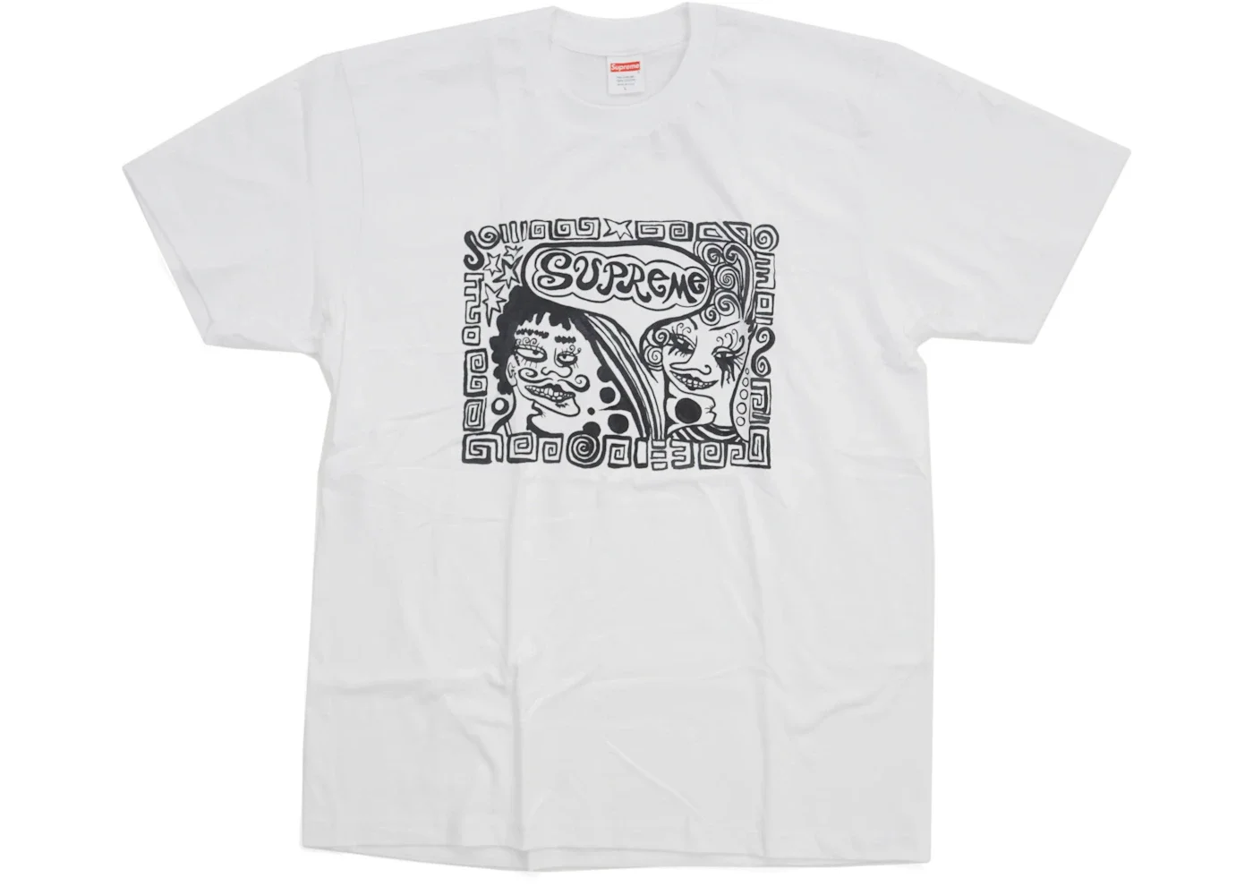 The Supreme Faces Tee White is a 100% cotton jersey t-shirt in White featuring a black screen printed illustration on the front. The sketch depicts two faces with toothy grins and prominent eyelashes within a frame of swirls and geometric shapes. Supreme branding is placed within a speech bubble from the face on the right. Supreme branding also appears on the interior collar label. Supreme, the New York-based skateboarding and streetwear authority, is well known for its graphic tees, which debut with each collection’s release, typically never to be reproduced. For the Fall / Winter 2018 collection, Supreme collaborated with New York-based artist Tabboo!, who has been showing work at legendary NYC spaces like ABC No Rio and Lucky Strike Gallery since the early 1980s. Our experts feel that the best feature of the Faces Tee is its distinct style illustration, front and central. The Supreme Faces Tee White was released on September 20, 2018, and retailed for $44. - Season FW18 - Color White - Release Date 2018-09-20 - Retail Price 44 - Featured false