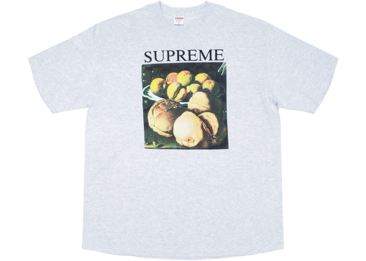 The Supreme Still Life Tee Ash Grey displays an artistic version of the still life genre with a bowl full of peaches and some burst-open fruits in the foreground. The stylish design of the Supreme Still Life Tee features a ribbed collar with a branded tag on the back. The t-shirt features a neutral grey colorway. Most of its branding and contrasts appear on the chest area. Black accents arise from "SUPREME" writing. Below it, a multicolor still-life imprint takes center stage. The rest of the material is plain, elegantly displaying the neutral grey tones. The cuffs on the short sleeves of this t-shirt fold inwards for fortification to match the hem. What outstanding features adorn the Supreme Still Life Tee Ash Grey? Our experts adore the still-life artwork covering the chest. Its colorful design delivers a touch of streetwear to a classic plain tee. The t-shirt was priced at $36 when released on August 20th, 2018. - Season FW18 - Color Ash Grey - Release Date 2018-08-20 - Retail Price 36 - Featured false