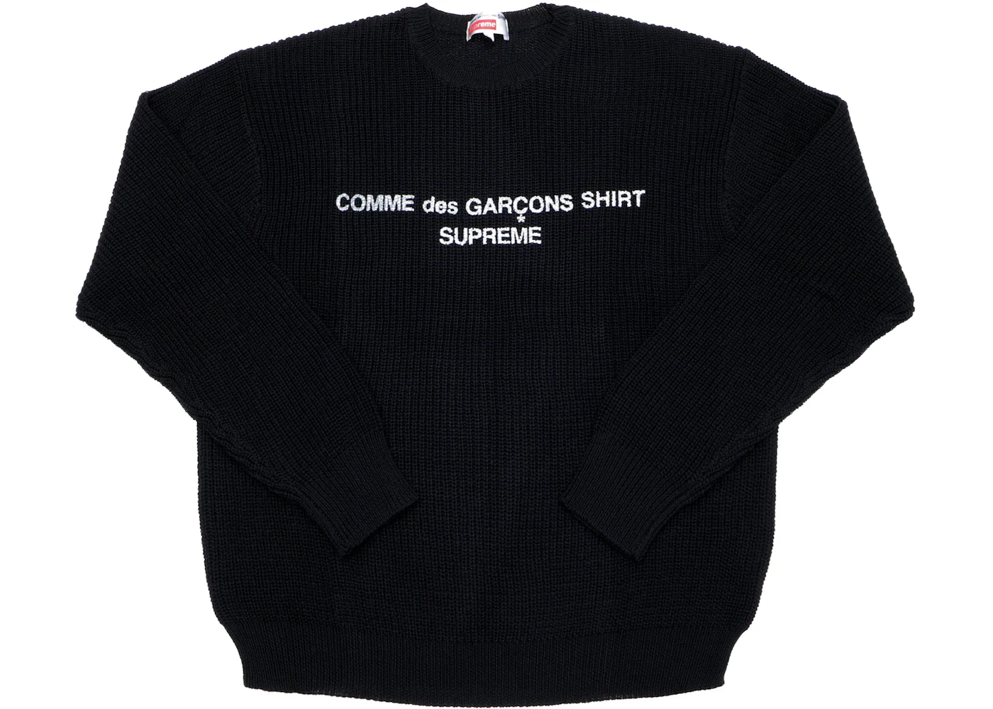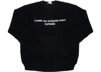The Supreme Comme des Garcons SHIRT Sweater Black is a collaboration between two iconic brands, Supreme and Comme des Garcons. This sweater was released on September 13, 2018, and retailed for $188. The sweater is made of 100% cotton and features a black colorway with a white Supreme box logo on the front and a Comme des Garcons SHIRT logo on the back. The sweater has a crewneck design with ribbed cuffs and hem for a comfortable fit. The black colorway is versatile and can be paired with a variety of outfits. The white box logo on the front adds a pop of contrast to the sweater, while the Comme des Garcons SHIRT logo on the back adds a touch of uniqueness. Something we love about the Supreme Comme des Garcons SHIRT Sweater Black is the collaboration between two iconic brands, resulting in a unique and stylish piece. Our experts think the standout feature of the sweater is the combination of the Supreme box logo and Comme des Garcons SHIRT logo, creating a one-of-a-kind design. Overall, we love the quality and attention to detail put into this collaboration piece. - Season FW18 - Color Black - Release Date 2018-09-13 - Retail Price 188 - Featured false