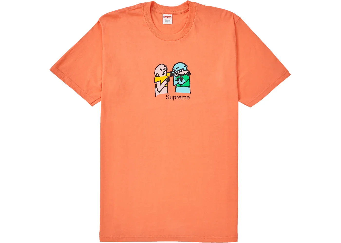 For their FW19 Week 17 release, Supreme released not only their Bandana Box Logo Tees but also an assortment of seven other winter tees. The Supreme Bite Tee released in seven different colorways and features a cartoon artwork of one person biting another persons arm. The Supreme Bite Tee released on December 19th, 2019 and retailed for $38 USD. - Season FW19 - Color Neon Orange - Release Date 2019-12-19 - Retail Price 38 - Featured false