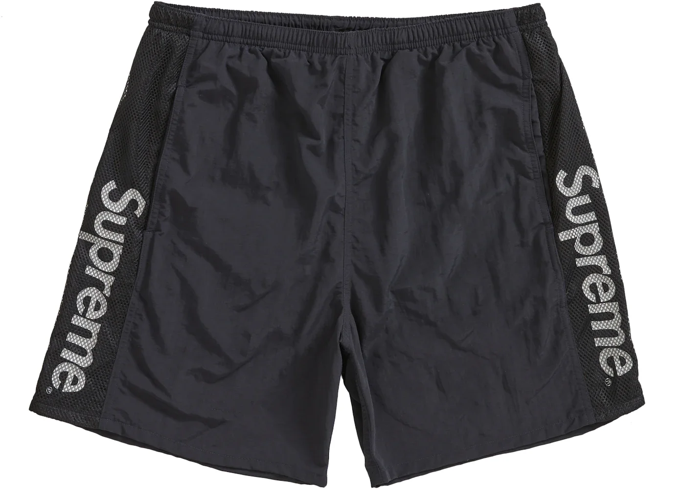 The Supreme Mesh Panel Water Short Black features a Taslan Supplex nylon material, a fabric with commendable water resistance, and moisture-wicking capabilities. The elastic waistband of the Mesh Panel Water Short has an internal draw cord that enables a comfy yet secure fit. It has a core black color matching the rest of the shorts. On each side is a side pocket with a welt design that allows it to disappear into the well-finished side seams. Mesh inserts run from the waist to the hem. Behind these overlays are bold "Supreme" imprints in white, which gets a unique pop owing to the darker background. A pocket with a zip closure and a small Supreme box logo on the flap embellish the right leg at the back. Among our favorite features of these shorts is the durable material used to make them. We also love the lettering on both legs that provides contrast and style. The Supreme Mesh Panel Water Short Black was released on July 2, 2020, for $110. - Season SS20 - Color Black - Release Date 2020-07-02 - Retail Price 110 - Featured false