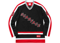 The Supreme Scarface Hockey Jersey Black is a polyester long-sleeved jersey with a Black body accented by combinations of red, white, and Black stripes at the collar, hem, and sleeves. Scarface branding angles down the front of the jersey, accented by a red Supreme script logo label. "83" appears on both sleeves, and the back displays "83" underneath Montana as the player's name. Supreme, the skateboarding and streetwear house, imbues cultural references into their work as expressions of their brand lifestyle. Oliver Stone’s 1983 crime drama Scarface is a favorite reference, from which the brand reinterpreted official imagery from the film and created new references to the film, as displayed in the Scarface Hockey Jersey. Our experts feel that the Scarface Hockey Jersey's best feature is its Montana and 83 branding, which calls out the film’s iconic main character and year of release. The Supreme Scarface Hockey Jersey Black was released on October 12, 2017, and retailed for $198. - Season FW17 - Color Black - Release Date 2017-10-12 - Retail Price 198 - Featured false