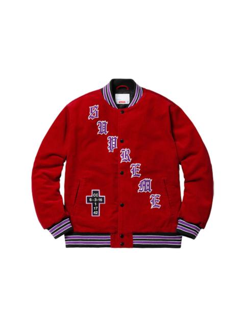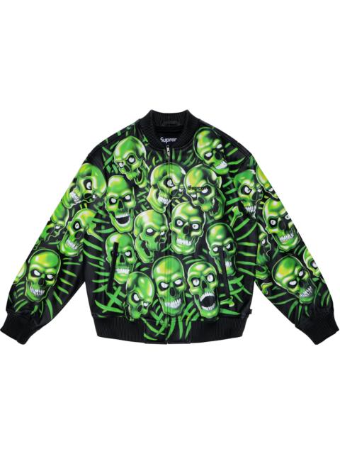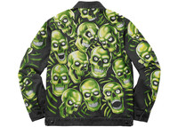 The Supreme Skull Pile Work Jacket Multi comes in a cotton twill material adorned by colorful printed skull piles that paint the front and back. A straight collar with a small spread ensures the Skull Pile Work Jacket provides a comfy fit. It features a red patch at the back with the Supreme branding popping in a white tint. Various green skulls, printed using Liquid Blue dye, appear on the shoulders, covering the chest and the lower areas. Some of the skulls are agape, while some firmly clench their teeth. The pattern repeats on the long sleeves and the back. The visible branding on this jacket includes a black embroidered Supreme graphic on the right side of the chest. What do our experts adore about the Supreme Skull Pile Work Jacket Multi? The maximalist style, characterized by a pile of myriad skulls, makes the apparel stand out. Of course, its classic features, such as a front zip closure and buttoned cuffs, are just as appealing. The jacket was released at a price of $258 on March 22nd, 2018. - Season SS18 - Color Multi - Release Date 2018-03-22 - Retail Price 258 - Featured false
