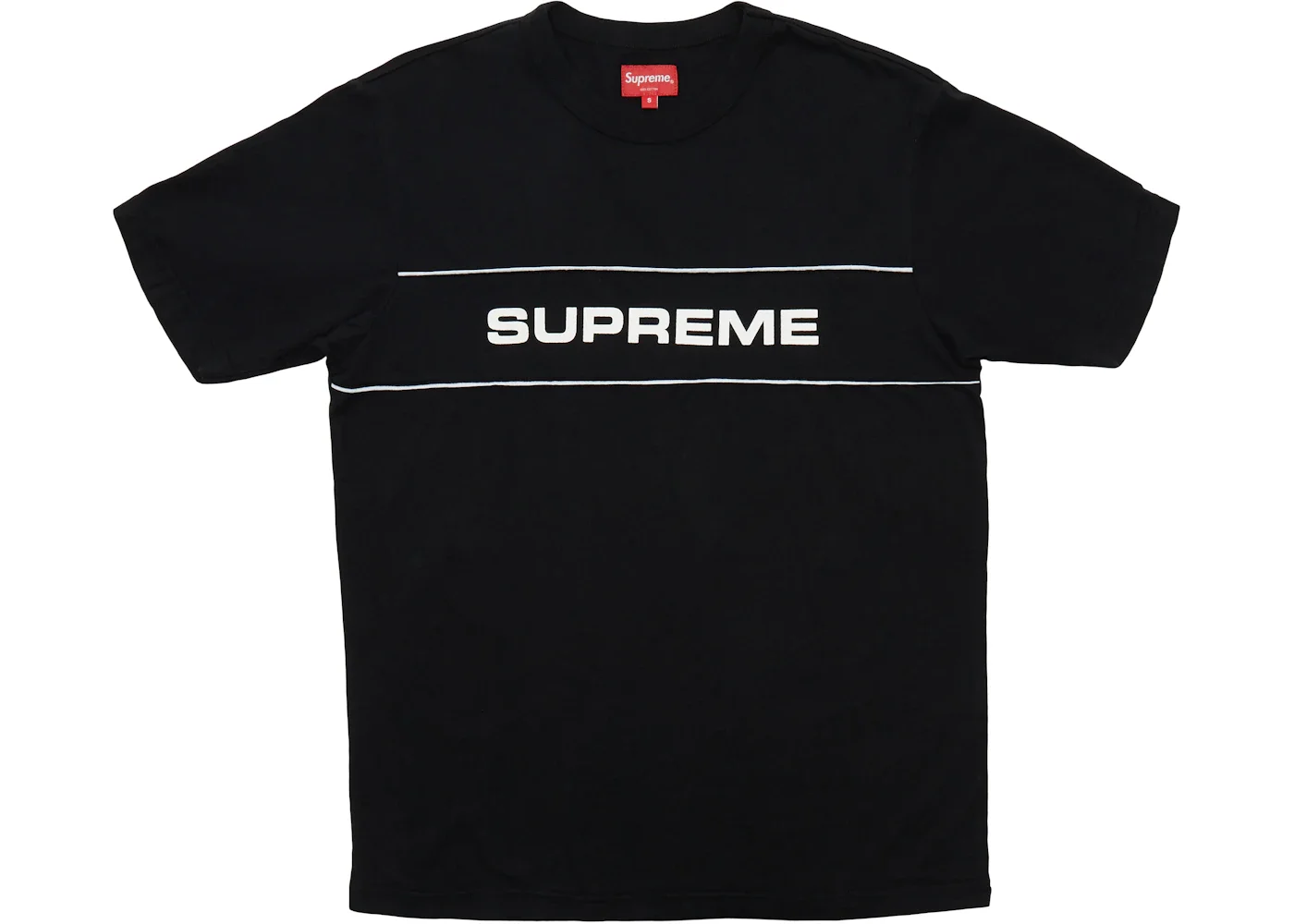 Get streetwear smart with the classic Supreme Team Ringer Tee Black. From one of the world’s leading hip-hop, skate, and streetwear labels, Supreme, wear your pride emblazoned on your chest with complete swag. Simple, classic, and cool, the Supreme Team Ringer Tee in bold black and white contrast colors is a trendy T-shirt made from a premium cotton blend. Iconic and striking, this tee boasts a ringer neck design and has the famous Supreme logo proudly emblazoned across the chest. A box-shape tee with mid-short sleeves, it is a loose, comfortable fit, offering the perfect solution for a street basketball game or a chilled-out movie night. We love this tee for its versatility and understated style. The simplicity of the logo placement speaks volumes, and it can be matched with anything from cargo pants to jeans or training shorts for a quick, ready-to-wear look. Need a fresh tee for a quick skate? Grab the Supreme Team Ringer Tee Black and get ready to shred in style. It was originally released on July 5, 2018, and was priced at $78 retail. - Season SS18 - Color Black - Release Date 2018-07-05 - Retail Price 78 - Featured false