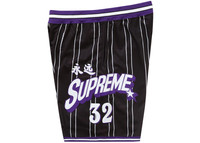 The Supreme Star Basketball Short Black sits at mid-thigh with breathable netting in black, accented by purple lines and a white star applique. There's an elastic waistband with draw cord to customize the fit, while side stripes and a woven Supreme label add an extra level of flair. The Black Star Basketball Shorts by Supreme features a 100% polyester net designed for optimal airflow. There's an interior draw cord that threads through metal eyelets. There are dual side pockets and an embroidered star at the left hem. The shorts feature a purple and white waistband and purple and white leg bands with white stripes, and "Supreme 32" is printed in purple and white below Chinese characters. One feature we love about the Supreme Star Basketball Short Black is the silicone-grip inner waistband, which holds shirts in place during movement, as well as the laser-cut vents at the back hem for added airflow. The pair retailed at $118 when they were released on June 13, 2024. - Season SS24 - Color Black - Release Date 2024-06-13 - Retail Price 118 - Featured false - Requester Kelsey K - Uploaded By LL