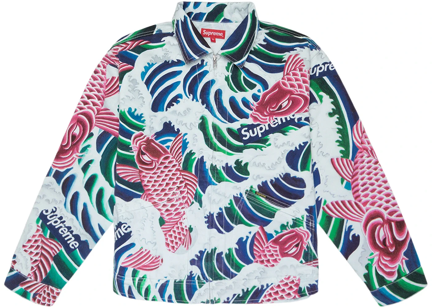 The Supreme Waves Work Jacket Multicolor is an all-cotton 13 oz. denim jacket, boasting vibrant hues, an all-over printed pattern, and a full-zip closure, emerges as a striking and eye-catching streetwear piece. The Multicolor Supreme Waves Work Jacket showcases a multicolored wave motif, presenting a visually captivating canvas for its bold graphics. Displaying the Supreme logo extensively across the front, sleeves, and back in white, it exudes an aura of exclusivity and brand prominence. Featuring button adjusters at the cuff and hem, the jacket comes with long sleeves, a zip closure for security, and double welt patch pockets at the lower front to ensure a snug fit. We think the defining attribute of the Supreme Waves Work Jacket Multicolor lies in its distinctive multicolor wave pattern. This design aspect not only injects a burst of vibrant hues, but also bestows upon the jacket a unique and fashionable allure. The jacket was released on the 28th of May 2020 for $228. - Season SS20 - Color Multicolor - Release Date 2020-05-28 - Retail Price 228 - Featured false
