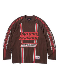 x Hysteric Glamour logo-print T-shirt Highlights - Chocolate brown - Crew neck - Side stripe detailing - Long sleeves - Logo print at the sleeve - Logo print to the front - Stripe detailing - Logo patch to the front - Logo print to the rear - Straight hem Imported Composition Fabric 100%