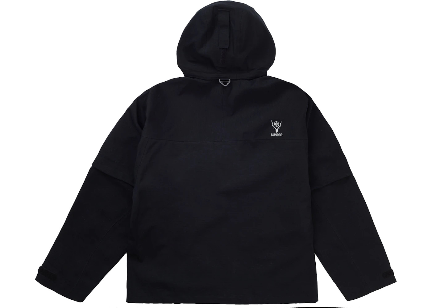 This black Supreme Jacket was made available in collaboration with Japanese brand, SOUTH2 WEST8. The Supreme SOUTH2 WEST8 collaboration is focused on fishing gear and even includes an authentic Kentara Japanese fishing rod. Supreme and SOUTH2 WEST8's River Trek Jacket features both brands logos on the front and back of a waterproof cotton 3-layer ripstop material. The Supreme SOUTH2 WEST8 jacket's features are many, including a removable hood and zip off sleeves as well as an interior elastic shock cord at the hem. The Supreme SOUTH2 WEST8 River Trek Jacket was released on April 22nd, 2021, at the retail price of $398 USD. - Season SS21 - Color Black - Release Date 2021-04-22 - Retail Price 398 - Featured false