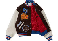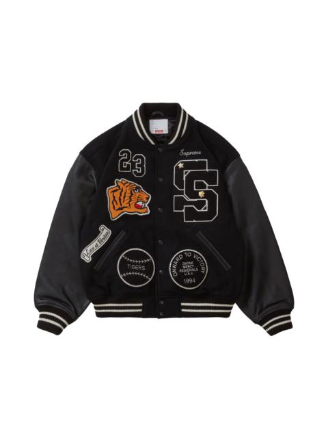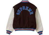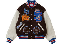 The Supreme Tiger Varsity Jacket Brown is a college-style jacket that features the classic design elements of a traditional American varsity garment. The body of the Brown Tiger Varsity Jacket is made of premium wool, which is a high-quality material that offers warmth, durability, and breathability. The wool is complemented by the light brown leather sleeves, and the front of the jacket has snap-buttons and two pockets. The jacket also includes ribbed cuffs, collar, and hem that add comfort and security. A quilted polyester lining in the interior gives both a soft and warm feel. There is also an interior welt pocket providing additional storage. The outdoor clothing item is finished with a tiger image and S lettering on the front adding to the branding elements. We think that the notable feature of the Supreme Tiger Varsity Jacket Brown is the striking embroidery on the back. The back design features a large text that reads "Supreme." The text adds an extra layer of detail and emphasizes the brand's name. The jacket was released on August 17th, 2023 at a retail price of $498. - Season FW23 - Color Brown - Release Date 2023-08-17 - Retail Price 498 - Featured false - Uploaded By LL