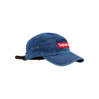 This Supreme camp cap is cut from washed cotton chino twill in a classic denim colorway. Made for the FW22 season, the hat features a signature box logo on the front and adjustable leather strap on the back.