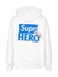 x Antihero hoodie Designed in collaboration with Antihero, this Supreme hoodie is decorated with a logo of the two brands on the chest and at the rear. This model is crafted from white cotton and features a straight, relaxed cut. Imported Composition Cotton 100%