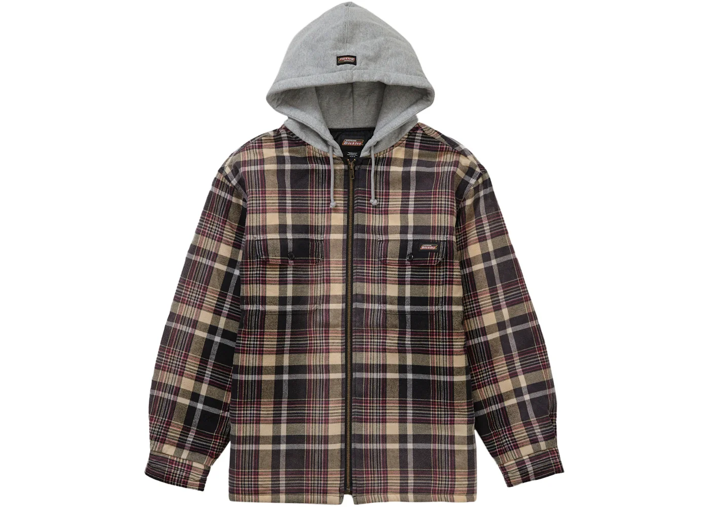 This Supreme x Dickies Plaid Hooded Zip-Up Shirt Black is a versatile and stylish piece combining elements of streetwear and workwear aesthetics. It features a classic plaid pattern in various shades of grey and black, giving it a timeless and casual look. A heather texture adds depth to the plaid design. A drawstring hood in solid gray gives a contemporary twist to the traditional button-up style of the shirt, while providing additional functionality and style. In keeping with Dickies' reputation for durable workwear, the shirt is crafted from a high-quality cotton-blend, ensuring comfort, breathability, and longevity. A quilted interior adds a layer of warmth for cooler weather. What our experts especially enjoy about this Supreme x Dickies Plaid Hooded Zip-Up Shirt Black is the dual branding that appears on the left chest pocket. This shirt originally retailed for a price tag of $148 when it first was released on October 19, 2023. - Season FW23 - Color Black - Release Date 2023-10-19 - Retail Price 148 - Featured false - Uploaded By LL