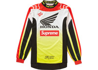 Supreme came in hotter than the sun itself with their Honda x Fox collaboration released as a part of their FW19 Week 6 drop which even included a literal Supreme Honda CRF 250R Dirt Bike. The full collaborative capsule featured items from helmets to jerseys to goggles to apparel, all of which features Supreme, Honda, and Fox branding. The Moto Jerseys released in two colorways and feature Honda's motorcycle logo (with the wing) above the Supreme logo and the Fox logo at the bottom. The Supreme Honda Fox Racing Moto Jersey Top released on October 3rd, 2019, and retailed for $158 USD. - Season FW19 - Color Red - Release Date 2019-10-03 - Retail Price 158 - Featured false