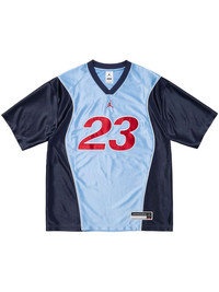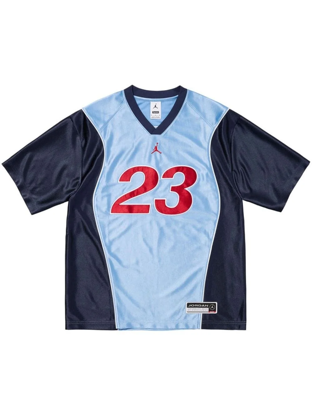 x Jordan Warm Up jersey Highlights - Blue - Signature jumpman motif - Applique logo - Contrasting panel detail - V-neck - Short sleeves - Straight hem Imported Composition Fabric 100%