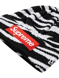 x New Era Box Logo beanie Supreme's penchant for bold branding is apparent in this beanie. Created in collaboration with headwear brand New Era, this knitted accessory boasts a black and white zebra pattern throughout and is detailed with the signature box logo on the front for a branded finish. Imported Composition Outer: Rubber 100%