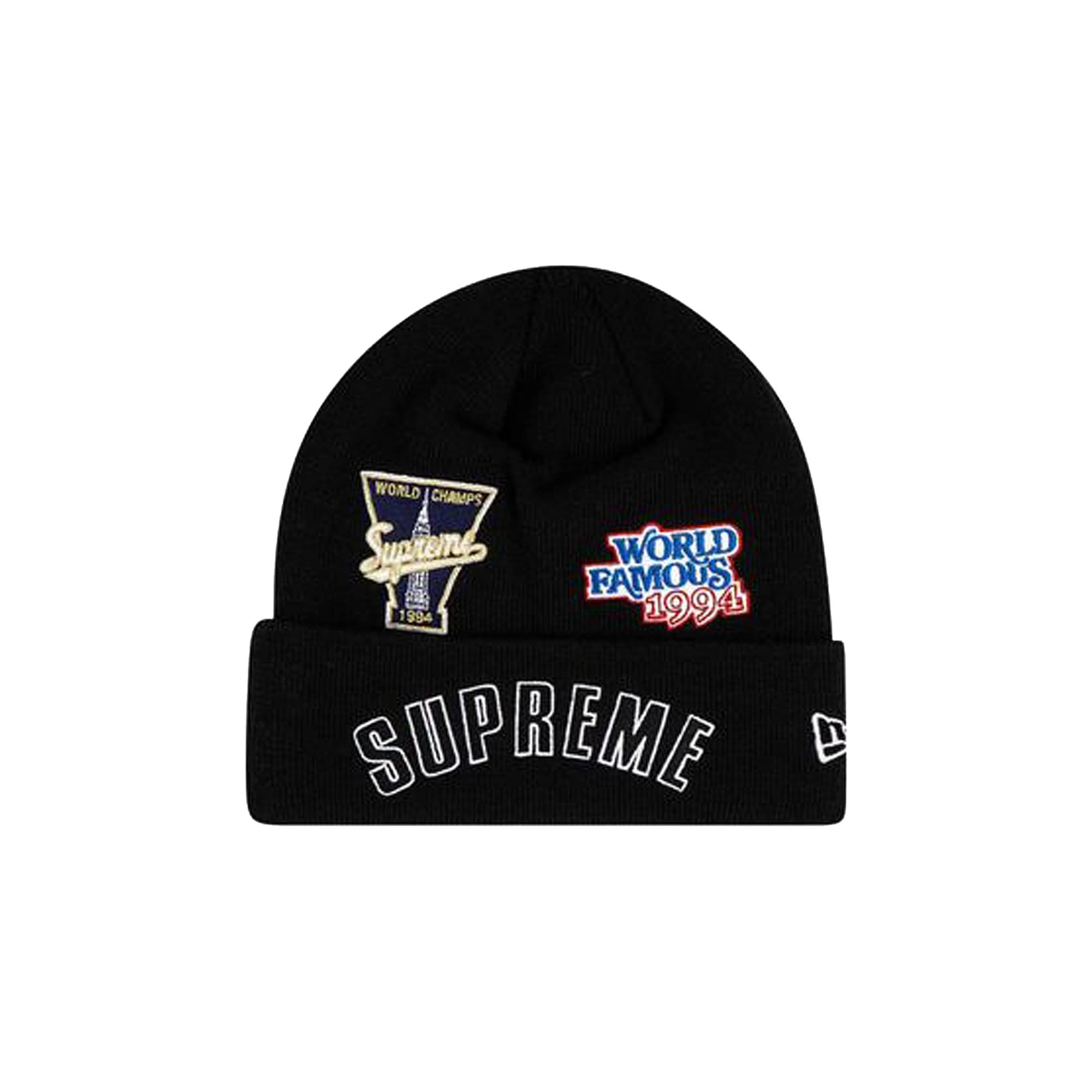 This Supreme x New Era x Championship beanie was released for the FW19 season. Knitted in black, the hat is detailed with branded patches including "World Famous 1994" and "Supreme World Champs." Each collaborator's logo is embroidered along the hem.