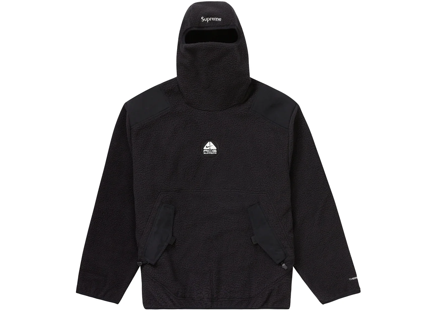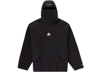 The Supreme Nike ACG Fleece Pullover Black features a Polar fleece that comes with nylon ripstop panels. It comes in a black hue and has zip pouch pockets with velcro flaps on both sides on the front of the jacket. This pullover in a black hue from Supreme and Nike has an elastic binding at the cuffs, a facemask hood, as well as its hem. The garment also features a woven logo label at the back neck tab and chest. The design is completed with embroidered logos at the back hem and hood. The Supreme Nike ACG Fleece Pullover Black made its debut in the market on the 15th of September, 2022, at a recommended retail price of $238. - Season FW22 - Color Black - Release Date 2022-09-15 - Retail Price 238 - Featured false
