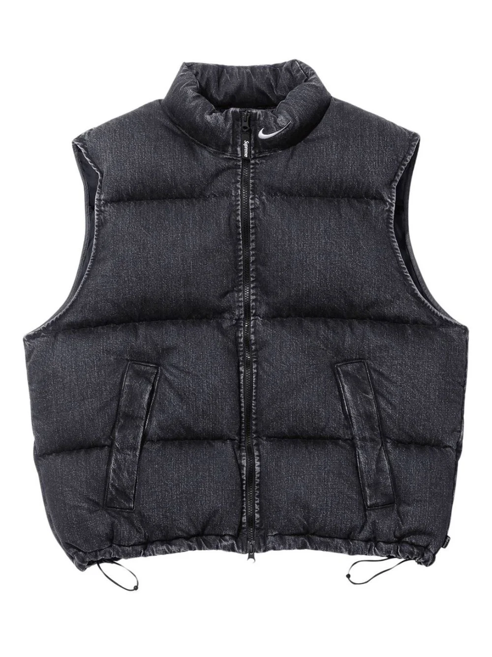 x Nike denim puffer gilet Highlights - Black - Logo embroidery - Zip fastening - Drawstring hem - Stand-up collar - Panelled design Imported Composition Denim 100% Washing instructions Read Manufacturer Guidelines