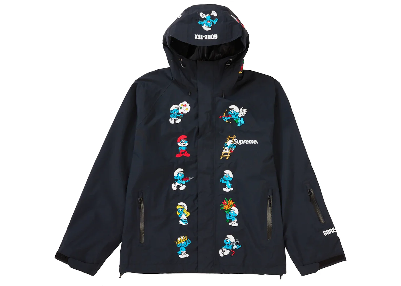 On the front, the Supreme Smurfs GORE-TEX Shell Jacket Black features the Smurfs engaging in playful activities like wearing a crown, presenting a flower bouquet, and painting the Supreme logo in white. The Smurfs also appear on the hood along with the GORE-TEX logo. A black background highlights the brightly colored characters on the front. The jacket also comes with zippered pockets for storage. Supreme Smurfs GORE-TEX Shell Jacket Black released in August of 2020 and retailed for $398. - Season FW20 - Color Black - Release Date 2020-08-20 - Retail Price 398 - Featured false