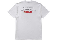 The Supreme The Killer Trust Tee White is a must-have for any streetwear enthusiast. This tee features a bold graphic on the front, showcasing the iconic Supreme box logo with the words The Killer Trust in bold letters. The white colorway adds a clean and classic touch to the design, making it easy to pair with any outfit. Crafted from 100% cotton, this tee is comfortable and durable, ensuring it will last for years to come. The ribbed crewneck and short sleeves provide a classic fit, while the tagless collar adds extra comfort. Released on October 25th, 2018, this tee quickly became a fan favorite and sold out within minutes. Retailing at $48, it's an affordable way to add a touch of Supreme to your wardrobe. Something we love about Supreme The Killer Trust Tee White is how it effortlessly combines classic design with bold graphics. Our experts think the standout feature of this tee is the striking contrast between the white background and the black graphic. It's a statement piece that's sure to turn heads. - Season FW18 - Color White - Release Date 2018-10-25 - Retail Price 48 - Featured false