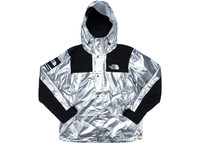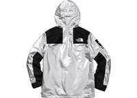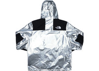 The Supreme The North Face Metallic Mountain Parka Silver is the result from a collaboration between the lifestyle brand and the outdoor clothes designers. This Metallic Mountain Parka arrives in an astronaut inspired silver colorway with touches of black on the chest, back, arms, and cuffs. The jacket from the Metallic collection is lightweight in nature, thanks to the nylon construction, and its is also 100% waterproof. The garment gets The North Face and Supreme motifs emblazoned on the chest, back, and arms. The Supreme The North Face Metallic Mountain Parka Silver hit the market in April 2018, on the 5th, and initially sold at a price of $388. - Season SS18 - Color Silver - Release Date 2018-04-05 - Retail Price 388 - Featured false